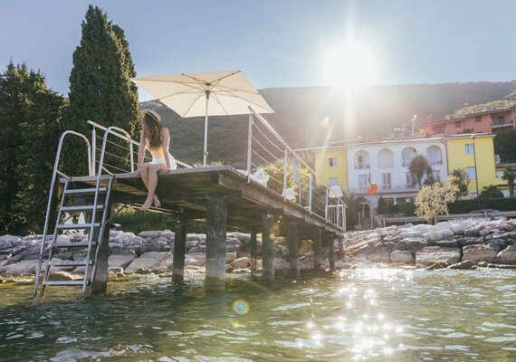 La nostra spiaggia privata è il suo pezzo personale di beatitudine sul Lago di Garda. Un rifugio esclusivo proprio sulle rive del lago, che può raggiungere facilmente in pochi passi. Appena si alza, può recarsi in spiaggia in accappatoio, dove comode sedie a sdraio la invitano a prendere il sole mentre il panorama mozzafiato della sponda occidentale di fronte e l'imponente sfondo montuoso la ispirano. Il molo balneare privato offre un accesso diretto alle acque limpide del lago, perfette per un tuffo rinfrescante o una nuotata. L'alta qualità dell'acqua e la sua piacevole profondità garantiscono un'esperienza balneare rilassante. Si goda il sole, il clima mediterraneo e senta le dolci brezze dei venti del Lago di Garda "Ora" e "Pelér" sulla sua pelle.